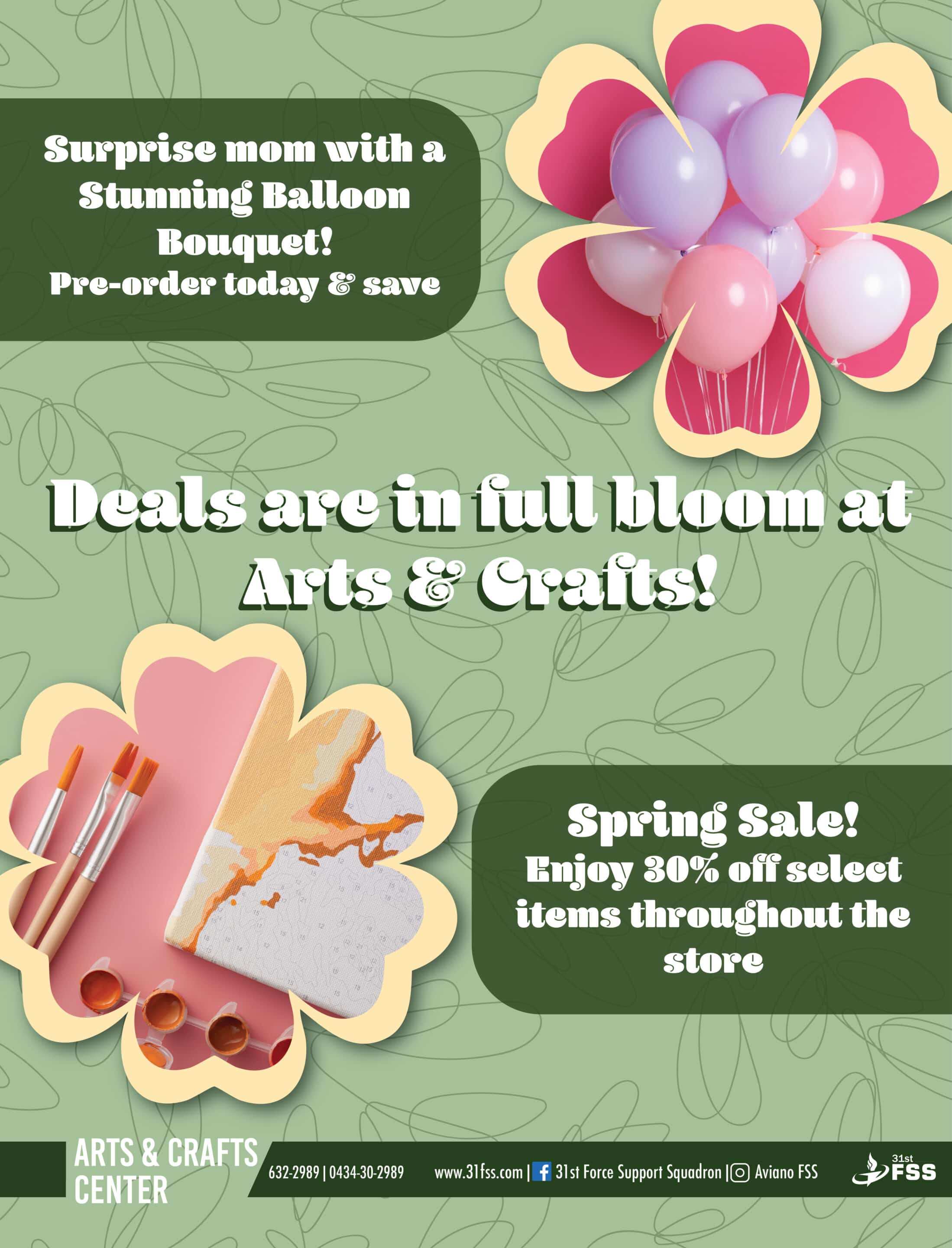 The Arts and Crafts Center is your one-stop shop for all things crafty! We can help with your latest Pinterest project and provide you with crafting supplies. We carry paints, brushes, canvas, fabrics, sewing notions, yarn, knitting and crochet supplies, and scrapbooking paper. We also have a great party supply section. The Arts and Crafts Center also houses a photo printer to handle your photos and souvenir art and engraving shop with friendly staff to assist in creating personalized gifts and awards. We are a great place to shop for PCS presents. We also sell balloons in-store for all your party needs, or if you already have balloons of your own and need them filled we will fill them for you! There is also a wood shop available for anyone looking to spend some quality time with a saw and power tools.